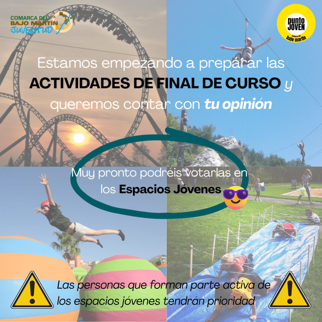 Desde Juventud de la Comarca ya se están preparando las actividades de final de curso y se quiere contar con la opinión de la juventud. Muy pronto se podrán votar las propuestas en los Espacios Jóvenes. Las personas que participan de forma activa en estos espacios tendrán prioridad.