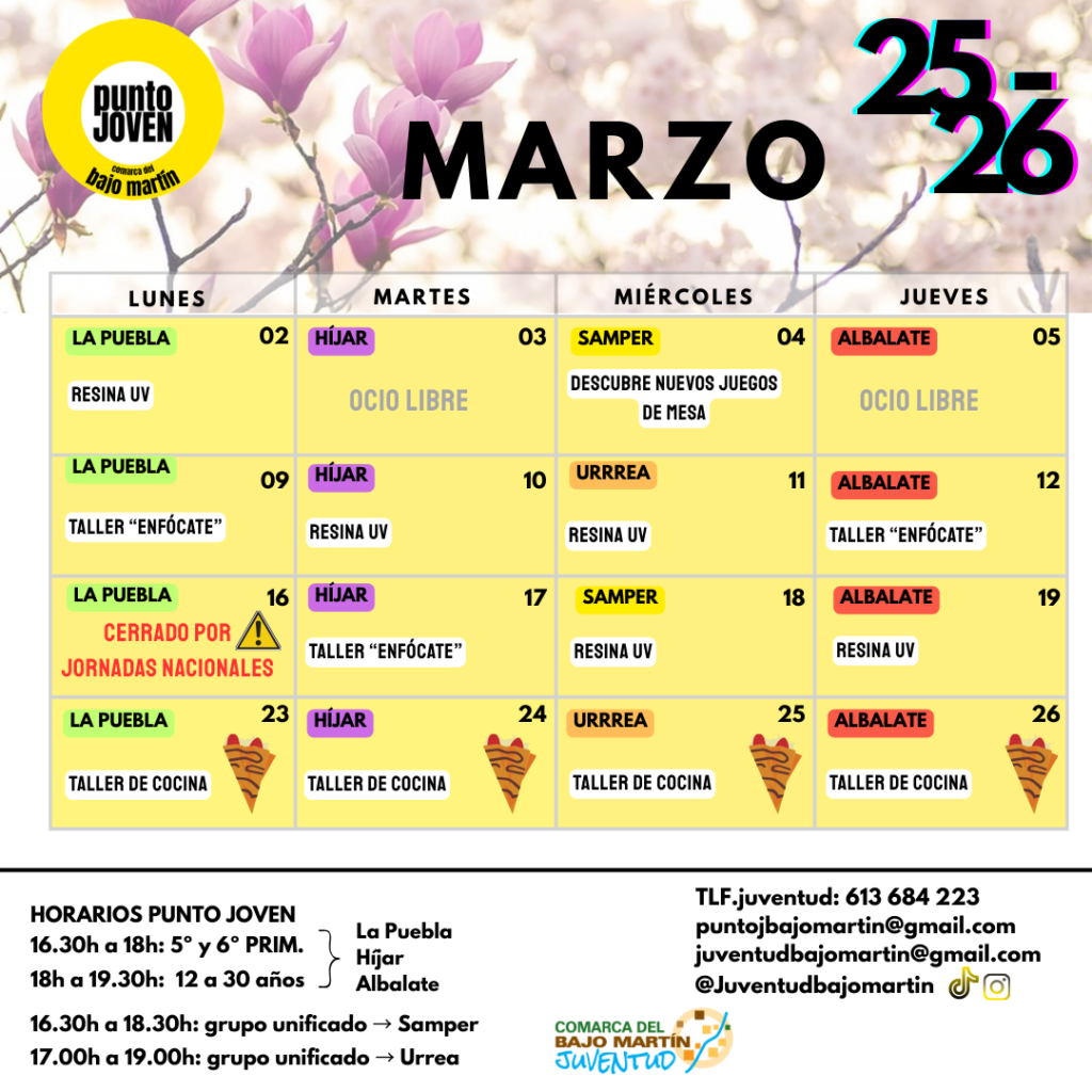 Los Puntos Jóvenes de la Comarca del Bajo Martín arrancan marzo con una agenda llena de propuestas para quedar, crear, jugar y pasarlo bien, con actividades adaptadas por edades y en distintos municipios: La Puebla de Híjar, Híjar, Samper de Calanda, Urrea de Gaén y Albalate del Arzobispo.
