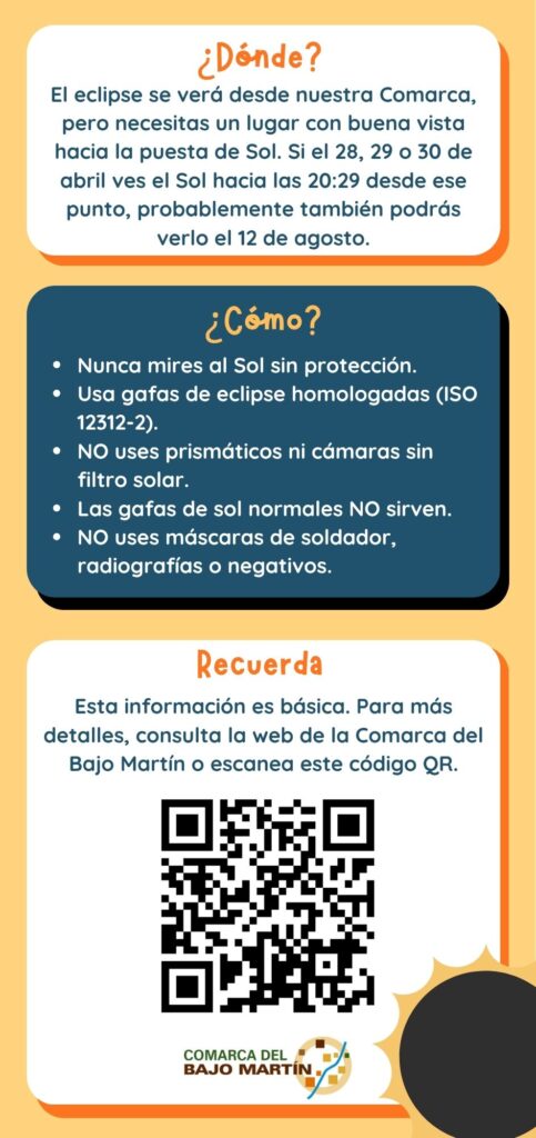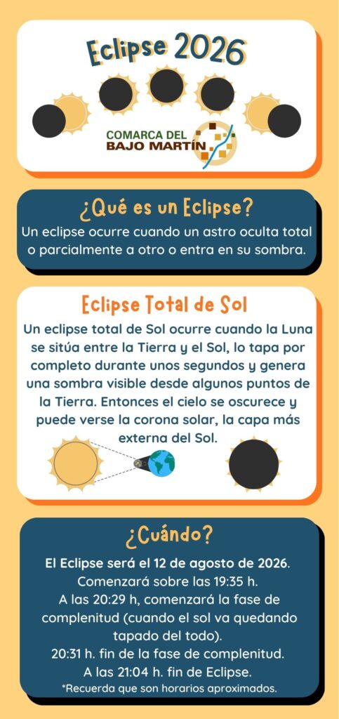 El próximo 12 de agosto de 2026 tendrá lugar un eclipse de Sol especialmente esperado en España. Será una cita astronómica de gran interés científico y divulgativo, y la Comarca del Bajo Martín quiere acompañar a la población en su preparación con información clara, sencilla y rigurosa.