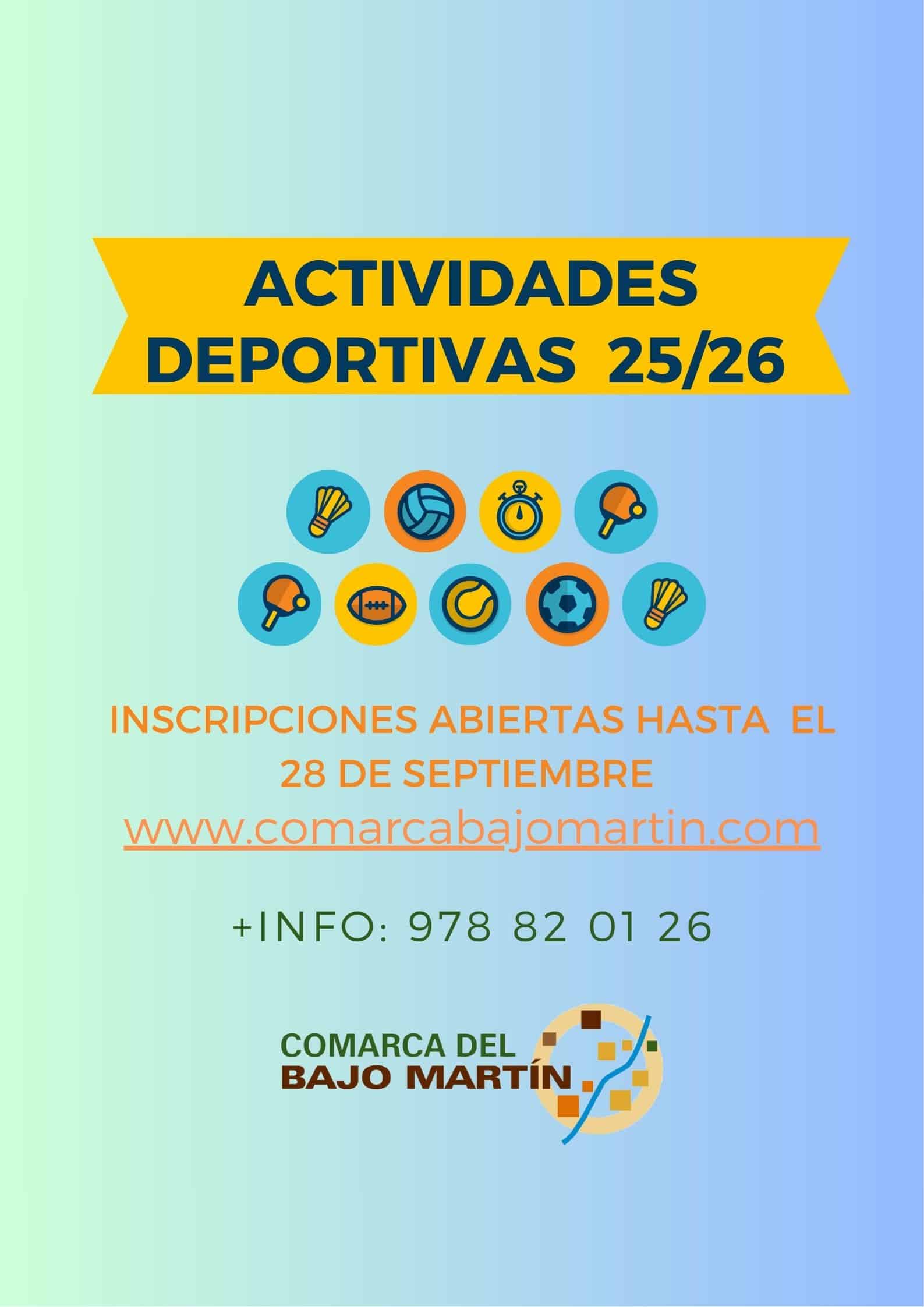 - 01/10/2024Comenzamos las diferentes actividades deportivas por las siguientes localidades de Albalate del Arzobispo, Hijar, La puebla de Hijar, Samper, Urrea…